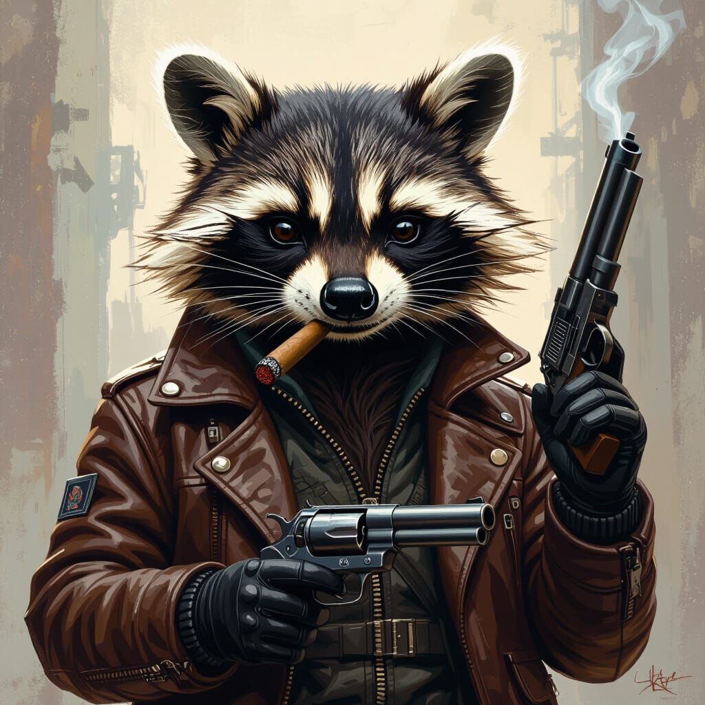 A raccoon sporting a leather bomber jacket and cigar, grips an antique firearm. This image blends futuristic realism with industrial noir and vibrant character art.