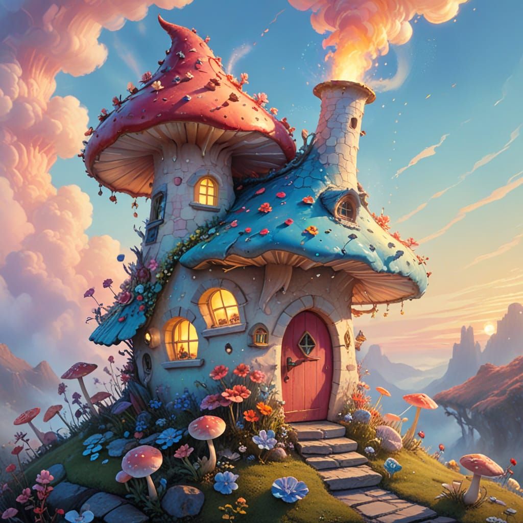 This image showcases a dragonet sleeping by a ruby-spotted toadstool house during sunrise. It features a soft watercolor palette with pale lemon and sky-blue mist, and overhead blossoms drift down.