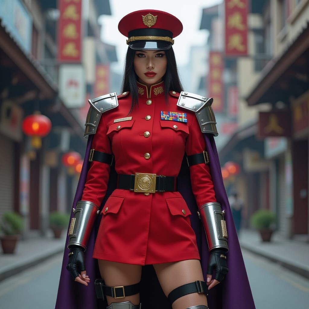A striking picture of a female martial artist in a dystopian future. The image showcases cyberpunk biomechanical elements, with red military attire and glowing energy, set against a desolate backdrop with Matrix-inspired code.