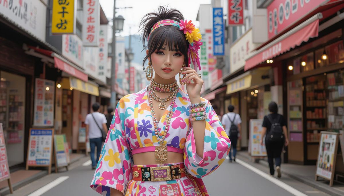A vibrant image of a punk gyaru girl in a colorful street scene. The artwork blends Okinawa's tropical vibes with eclectic Shibuya and Harajuku styles, as pop art.