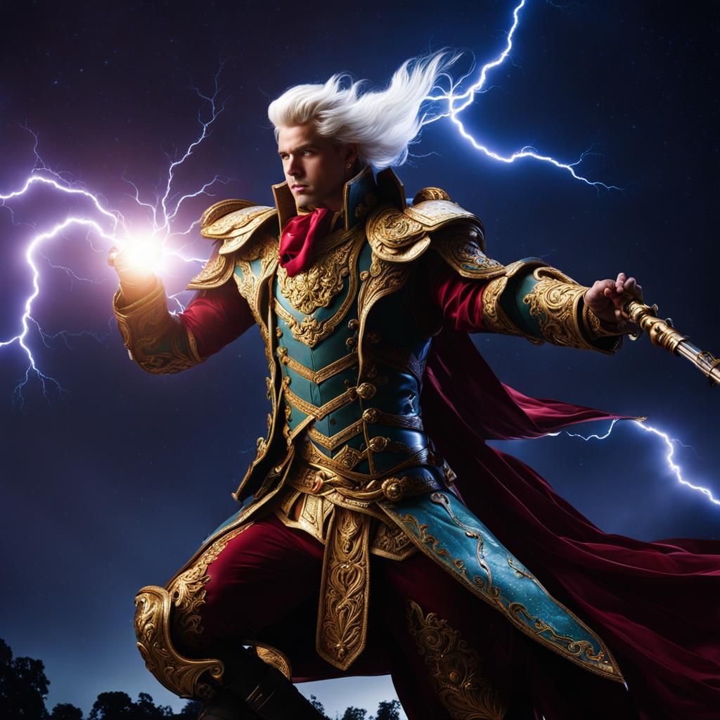 A digital rendering of Orion the Hunter on Mount Olympus, illuminated by lightning. The image captures a Rococo style with dynamic catch lights and a dramatic splash art effect.