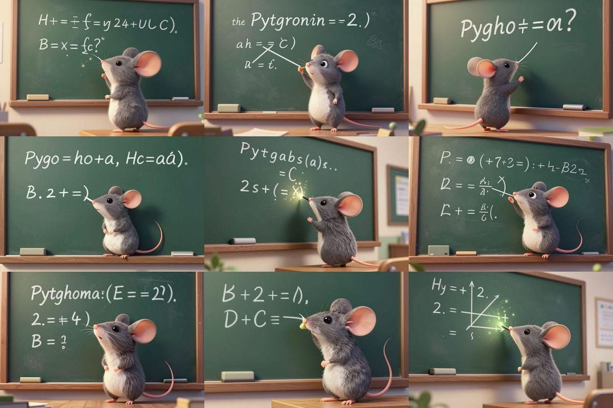 This image showcases a detailed 3D anime artwork of a mouse diligently solving the Pythagorean theorem at a blackboard, featuring intricate details and a breathtaking aesthetic.