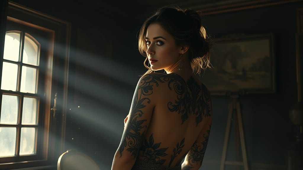 This image depicts a woman with detailed swirling tattoos in a dimly lit antique room. Sunlight streams through a dusty window, with dramatic lighting and rich colors in a Baroque art style.
