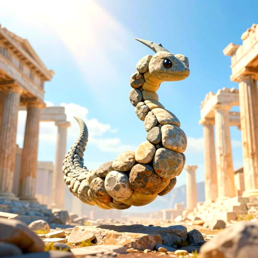This image shows Onix, a stone Pokémon, floating serenely in the pure air of Mount Olympus. Ancient Greek architecture forms the background of this mythical scene.