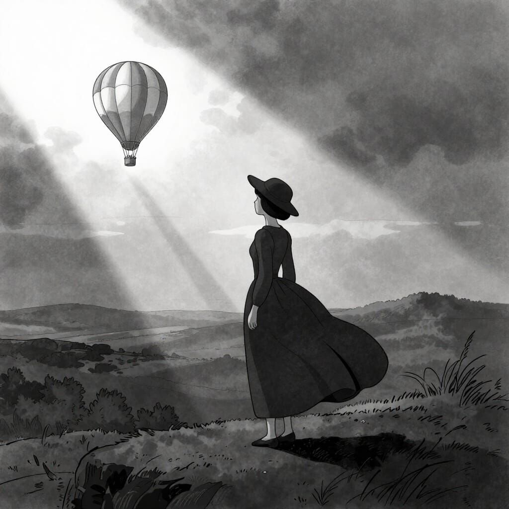 This minimalist line art features a woman in a long dress and hat against a surreal landscape inspired by Studio Ghibli. A hot air balloon floats in the distance, with dramatic sun rays and atmospheric haze creating depth. Rendered in a charcoal 2D style.