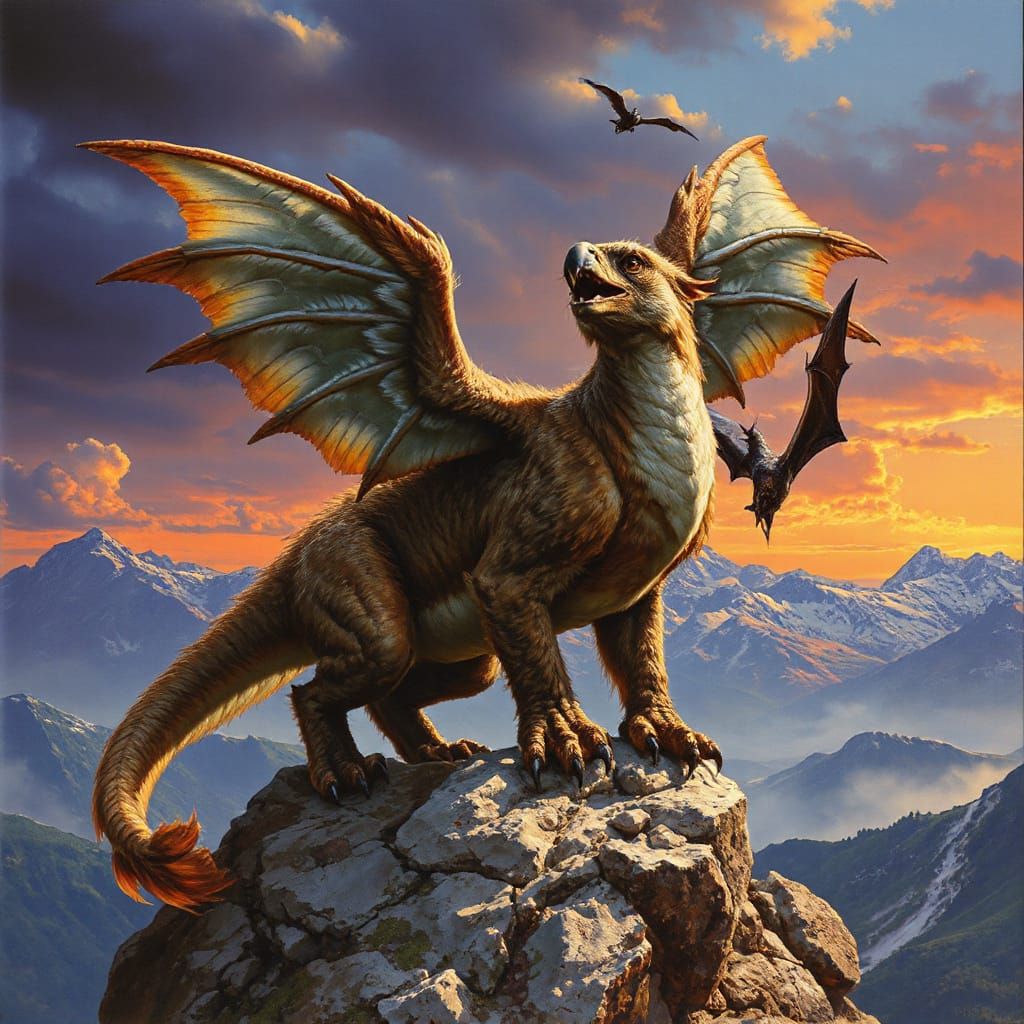 This image depicts a fantastical creature, a griffin, perched atop a rugged mountain crag, gazing out at a mystical landscape below, with its iridescent scales and tattered wings adding to the sense of wonder and awe.