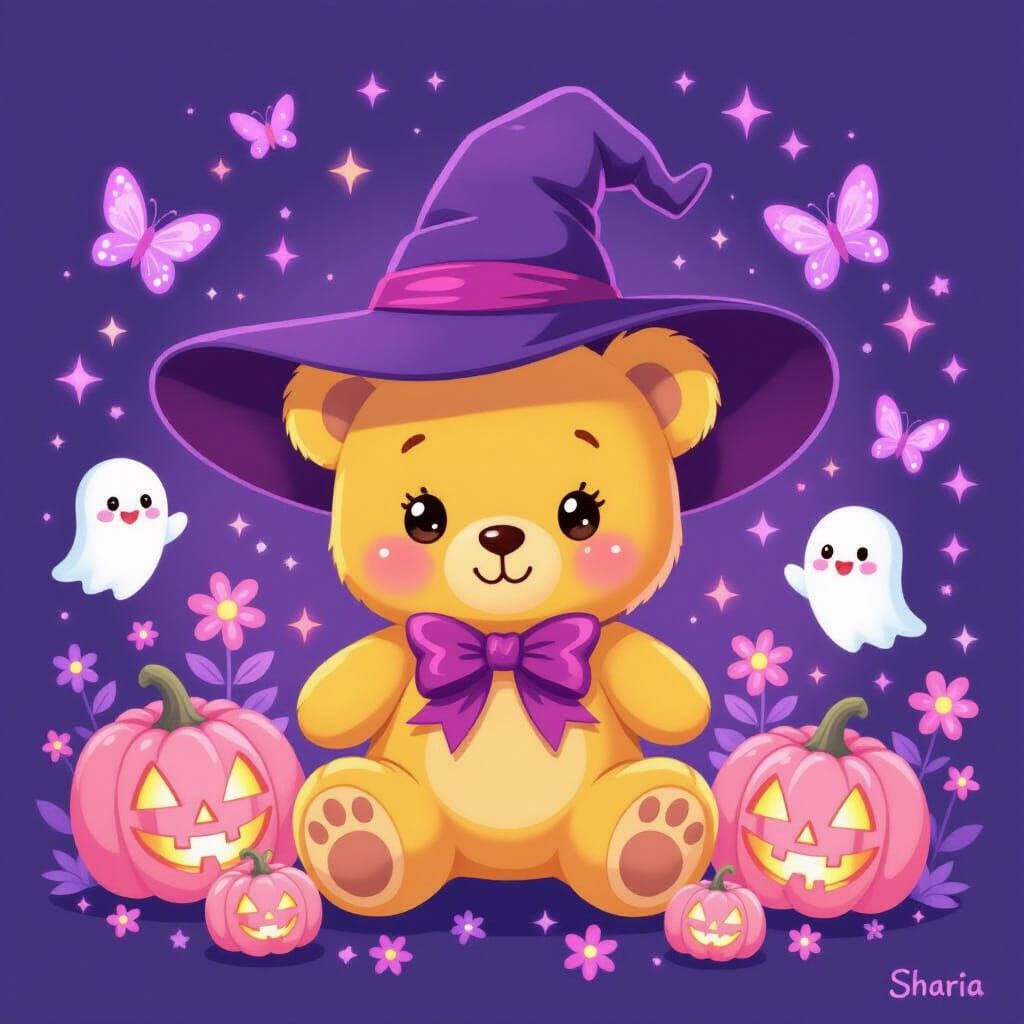 This image features a cute yellow teddy bear in a witch hat, with pink pumpkins, rainbow sparkles, and smiling ghosts. It's a kawaii, chibi-style fantasy illustration with soft, magical lighting.