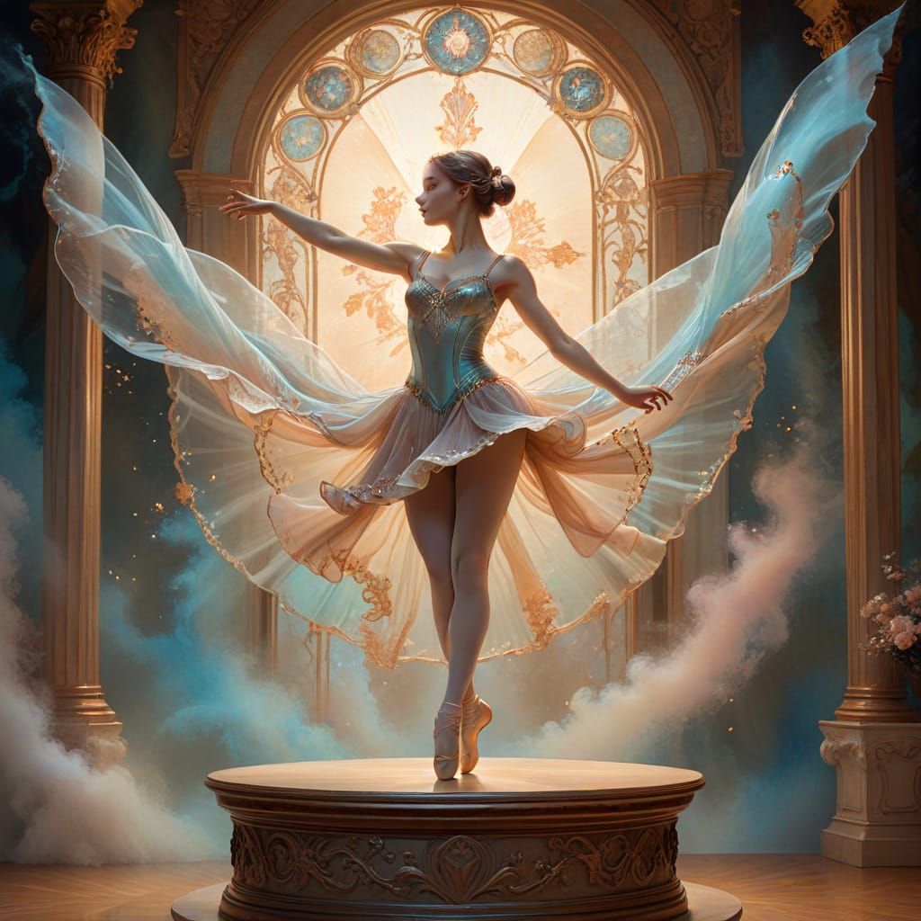 A surrealist digital painting depicts a ballerina dancing with a partner on a podium, bathed in ethereal light and iridescent shimmer. Features include subtle dust motes and a dreamlike studio background.