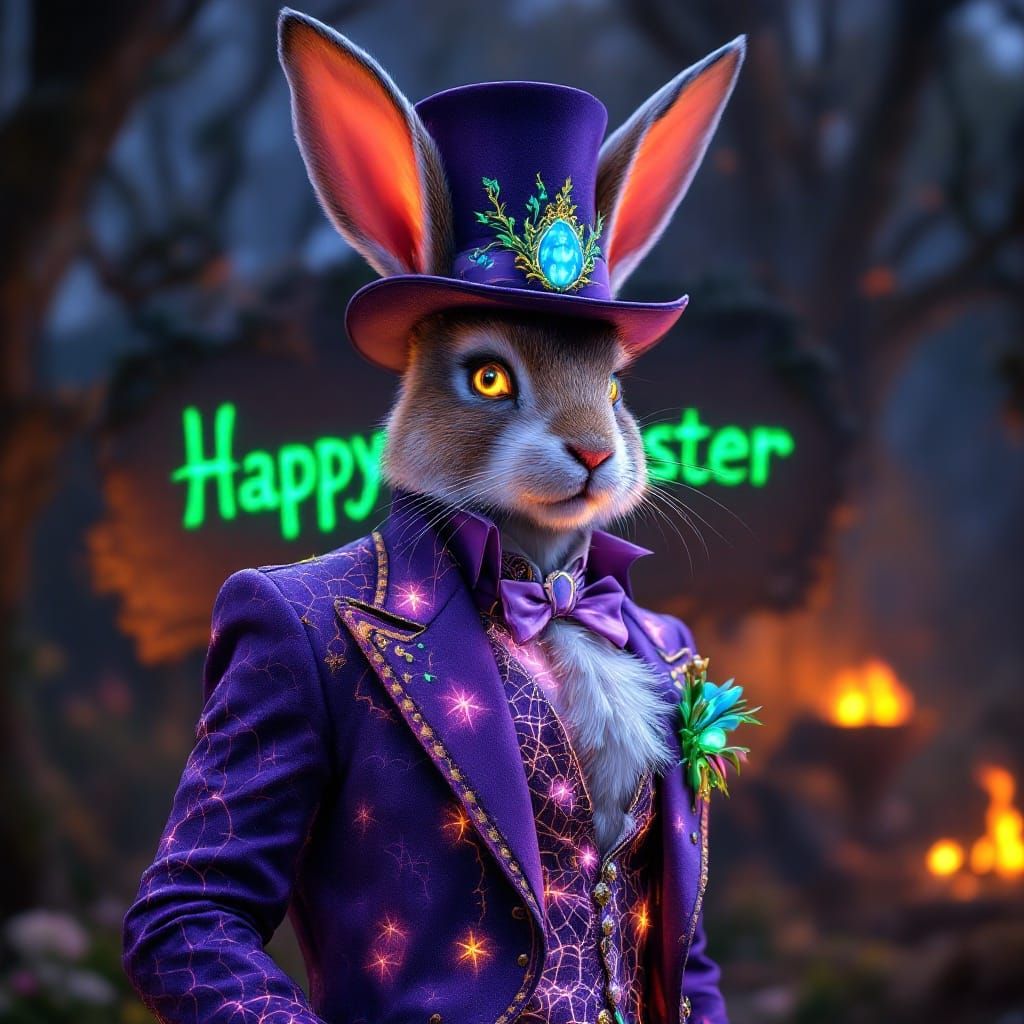 This stunning image captures a majestic male Easter bunny, Peter Cottontail, standing in a captivating pose, adorned with intricate purple clothing, bioluminescent tattoos, and a majestic top hat, set against a rich, dark, and immersive campfire background, reminiscent of a mystical high-fantasy world.