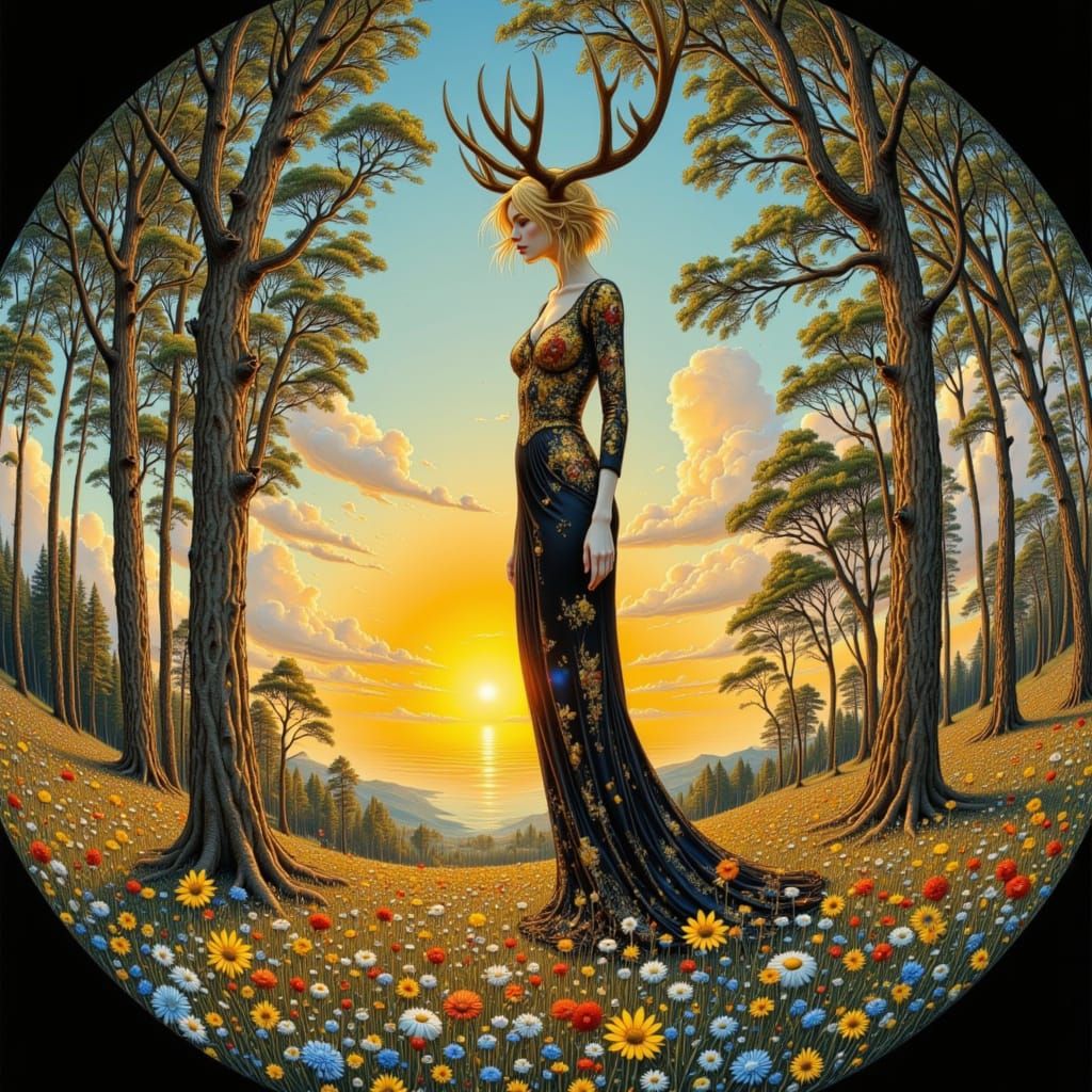 fisheye lens effect <lora:360 Degrees:1.0> <lora:Female Face:0.8> <lora:Best of both Worlds:1.0> Art by Ralph Steadman John Bauer Kay Nielsen Maxfield Parrish Arthur Rackham, sunset, jewel tones, vibrant colors, wooded glade, A tall, beautiful, slender blond woman, full lips parted, cleft chin, standing ...