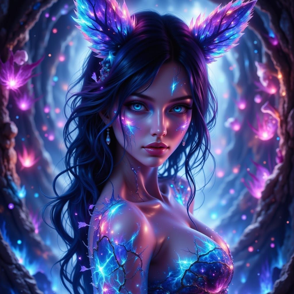 This image showcases a kitsune demon woman in a striking, translucent Race Ambassador outfit. Rendered in a vibrant anime style with neon lighting, it features sharp details and glowing accents.