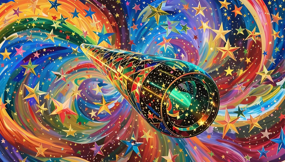 A mesmerizing, high-velocity metallic cylinder reflects a cosmos of impasto swirls and stars. This image presents a surreal, dreamlike scene with vibrant colors and unbounded motion.