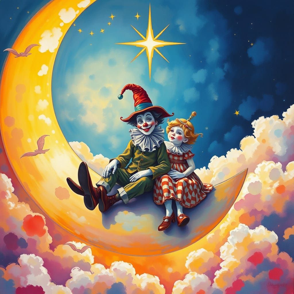 A captivating painting of Pierrot and Colombine on the moon, bathed in soft, divine light, with thick brush strokes and textured gouache watercolors, blending street art and Impressionist styles in a colorful, ultra-detailed masterpiece.