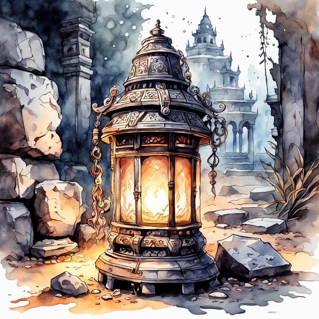 This image shows a detailed watercolor sketch of a glowing travel lantern on ancient stone. Mist-shrouded ruins and intricate filigree create an atmospheric fantasy scene with soft, ethereal lighting.