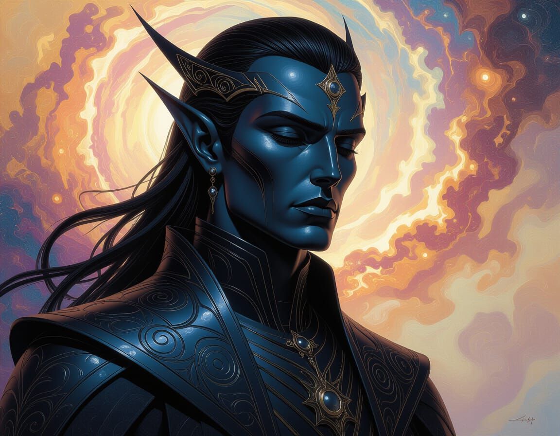 A striking picture of a regal energy being with obsidian skin, set against a cosmic galaxy backdrop. The image exudes serene power and wisdom as 3D rendered digital art.