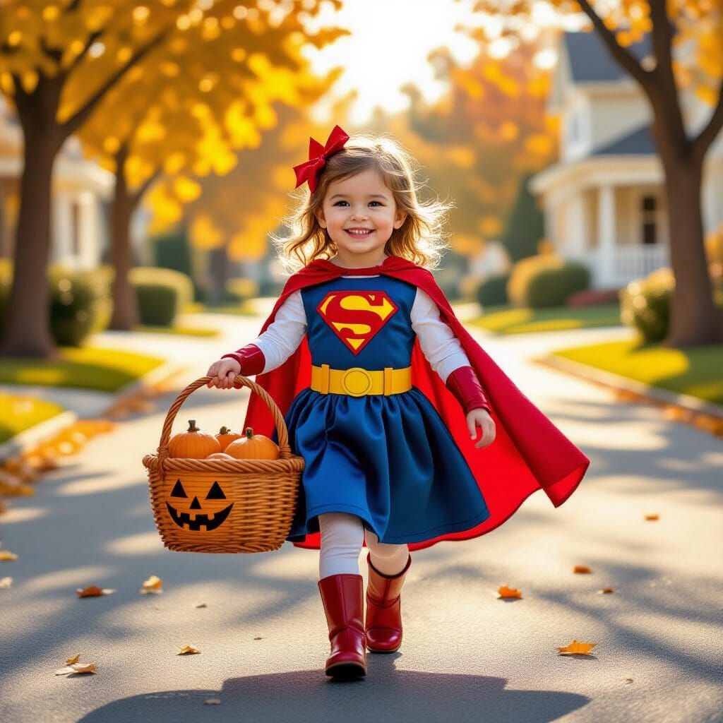 A happy little girl in a superhero dress walks down a street holding a full Halloween candy basket, bathed in warm, golden light with detailed art.