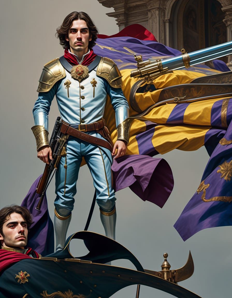 This image shows a Spanish soldier with a rifle amidst a desolate war landscape. The digital art features detailed textures, dramatic lighting, and a warm, high-contrast color scheme in a cinematic style.