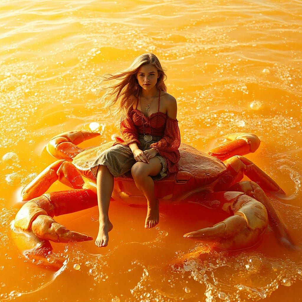 This AI artwork depicts a youthful woman in bohemian attire on a giant gummy crab within a surreal soda ocean. Dominant amber, tangerine, and bronze tones create a dreamlike, ethereal atmosphere.