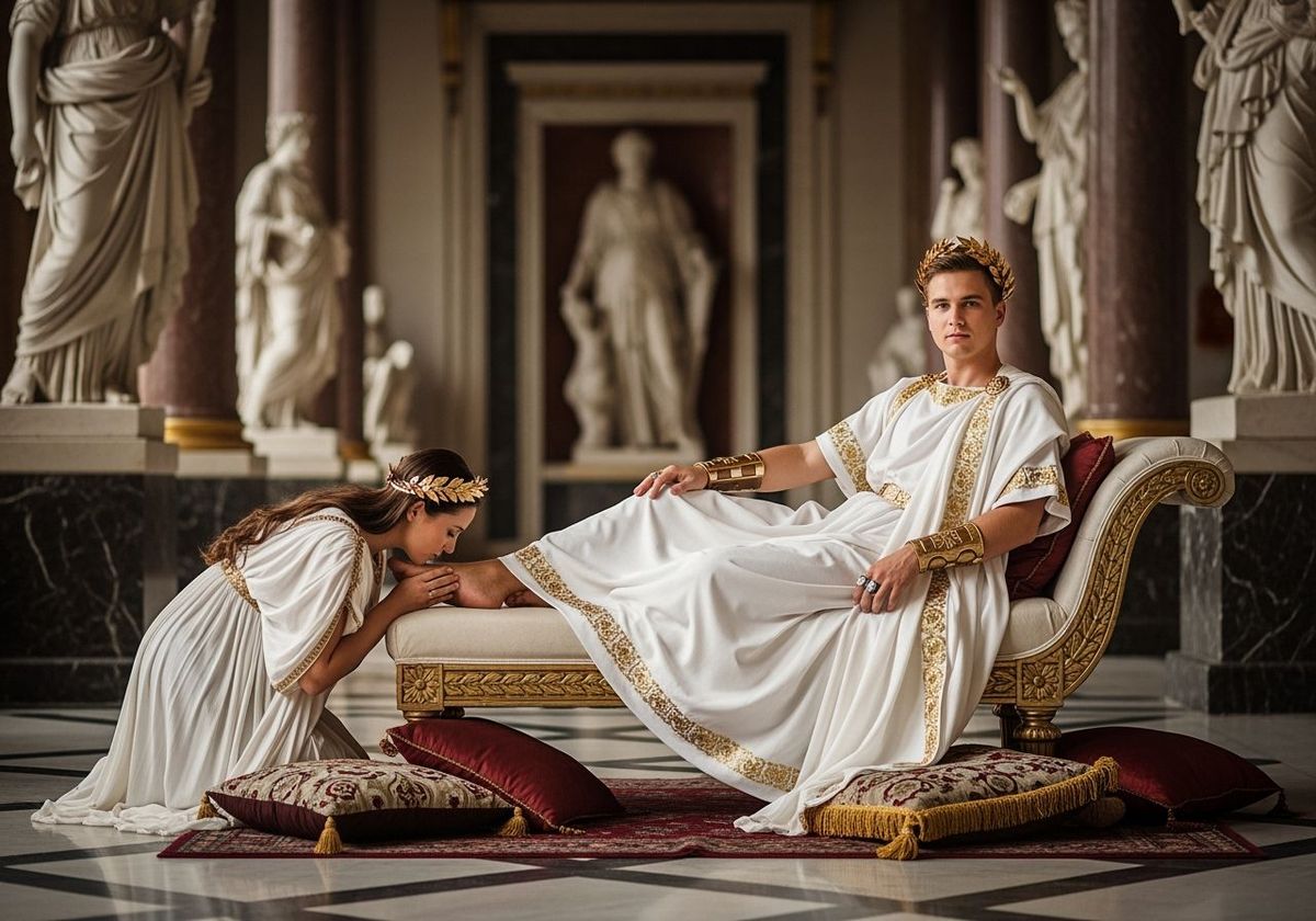 This image shows a Roman Emperor resting on a chaise lounge inside the Imperial Palace. A priestess kneels before him and kisses his feet. Statues and columns decorate the scene, captured in photorealistic style.