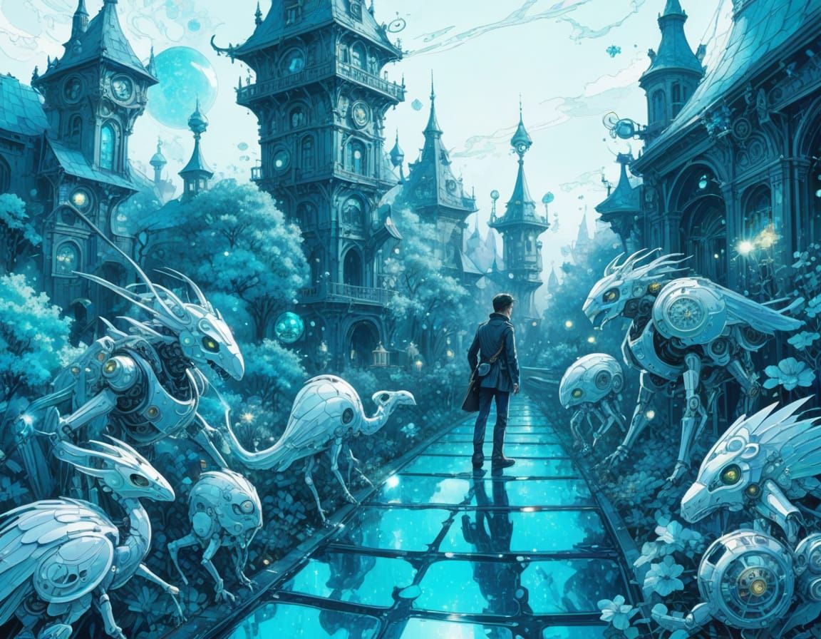 This image shows fantasy animal adventurers on a mysterious path, depicted in monochromatic turquoise ink and watercolor. The storybook illustration features clockwork details, shimmering gloss, and luminous reflections in a clockpunk style.