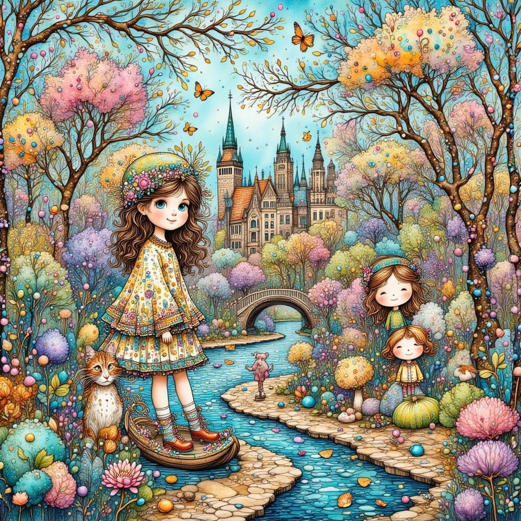 This image features charming, whimsical characters inspired by the artistic styles of Tove Jansson and Jean Ignace Isidore Gérard, rendered with a playful, illustrative quality.
