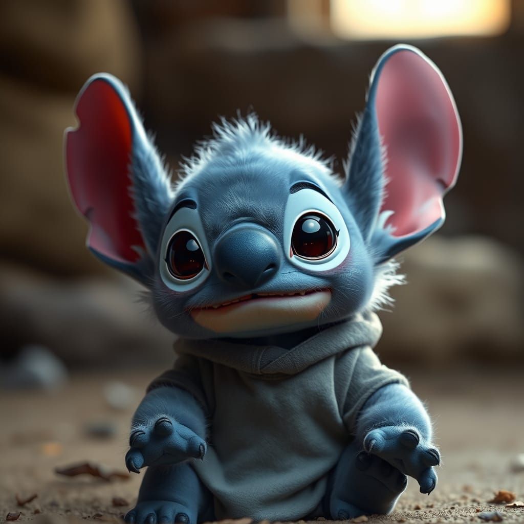 This image shows a photorealistic, live-action depiction of Stitch as a cute baby with fluffy fur, wearing a onesie. The style evokes soft, natural lighting and intricate textures.