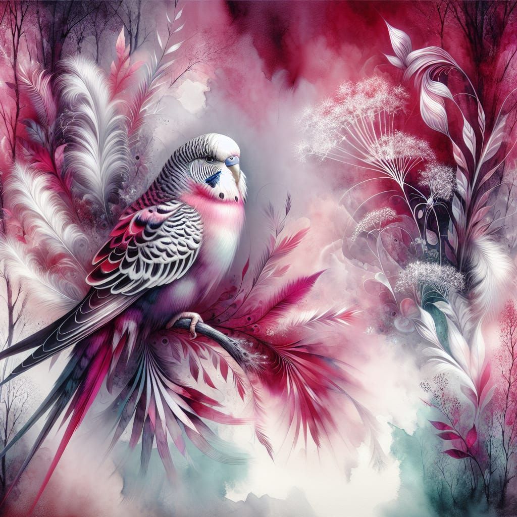 This image shows a budgerigar with pink, white, and crimson plumage, perched on a branch. The bird is set against a dreamy forest backdrop with ethereal lighting, rendered in watercolor and airbrush style.