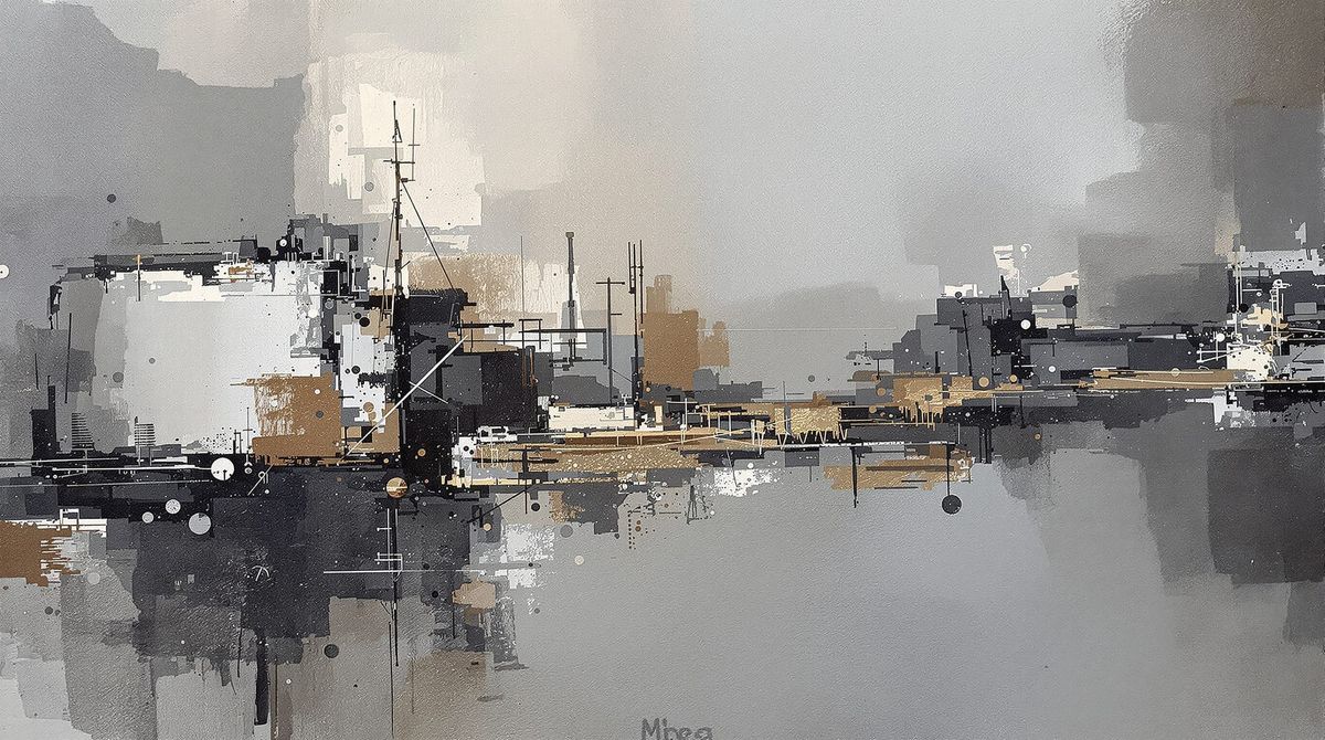 This image features a gray industrial base with rich fresco and oil on canvas textures, enhanced by metallic accents and subtle pastel washes.