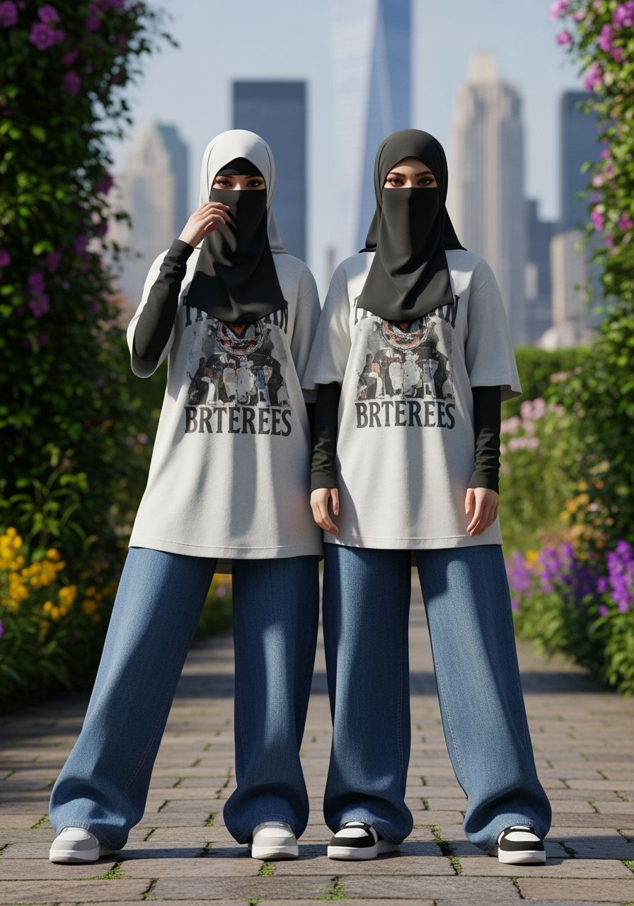 This image shows two stylish young women in niqabs posing in a lush botanical garden. They wear casual, modern clothing with the New York City skyline blurred in the background. The artwork is detailed digital rendering.