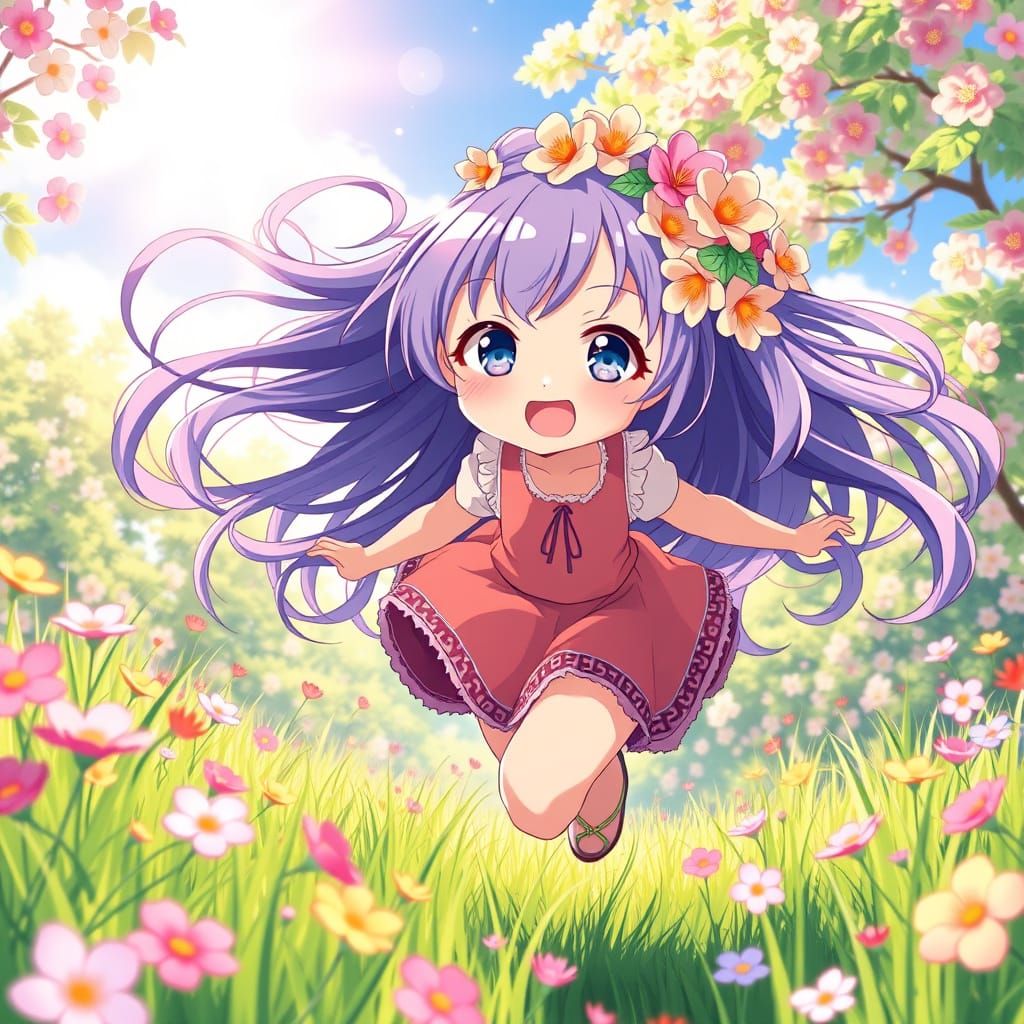 A young anime girl's joyful spirit shines in this colorful meadow scene, featuring vibrant flowers, cel-shaded animation, and cinematic lighting.