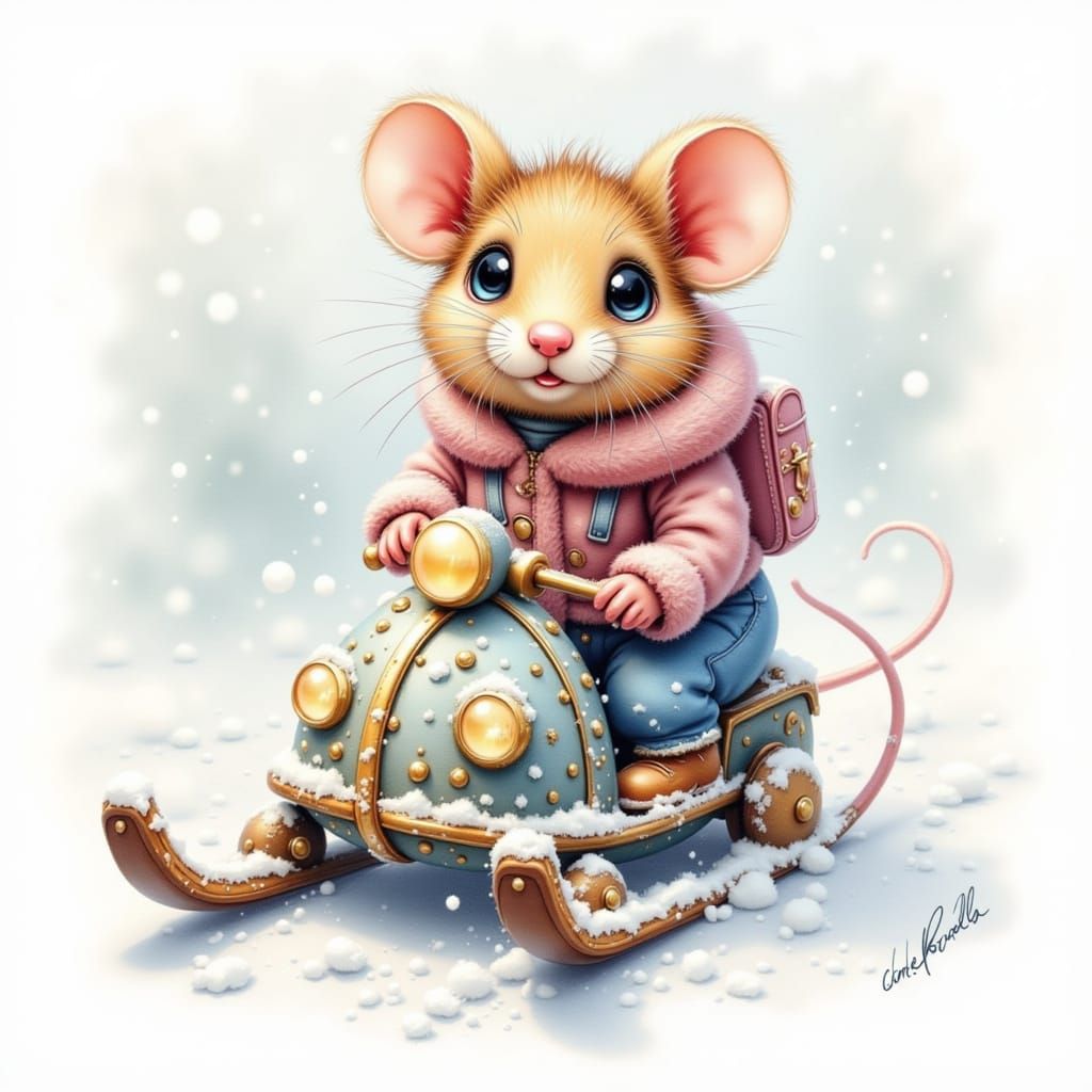 This charming image shows a small mouse dressed in a snowsuit and boots, joyfully riding a snowmobile. The artwork features big, expressive eyes and a whimsical, painted style.