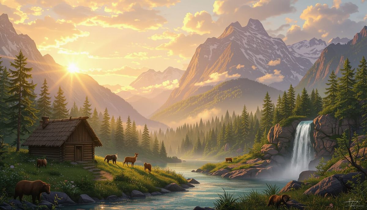 A serene natural landscape featuring a vibrant forest, rustic hut, majestic mountains, and waterfall, bathed in warm sunrise light. Lush foliage and misty atmosphere create a dreamy, romanticized scene.