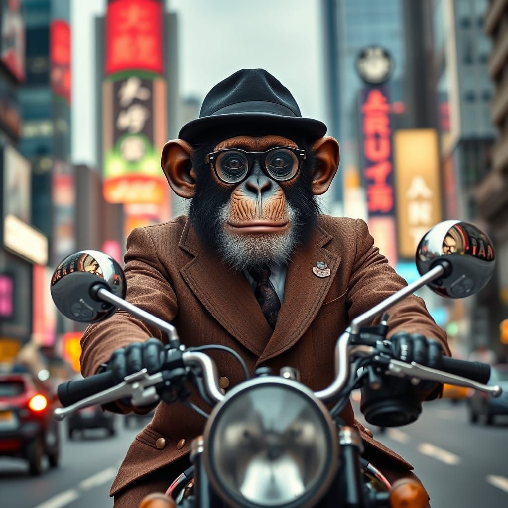 A striking picture of a chimpanzee wearing a bowler hat and monocle while riding a vintage motorcycle through a busy city. The image captures a playful and intimate moment with vibrant colors and sharp focus.