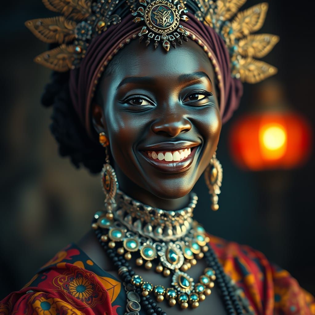 A stunning photorealistic image shows a smiling Black woman with dark skin, wearing colorful, detailed clothing, an ornate headpiece, and futuristic jewelry. The piece features dramatic lighting and atmospheric depth.
