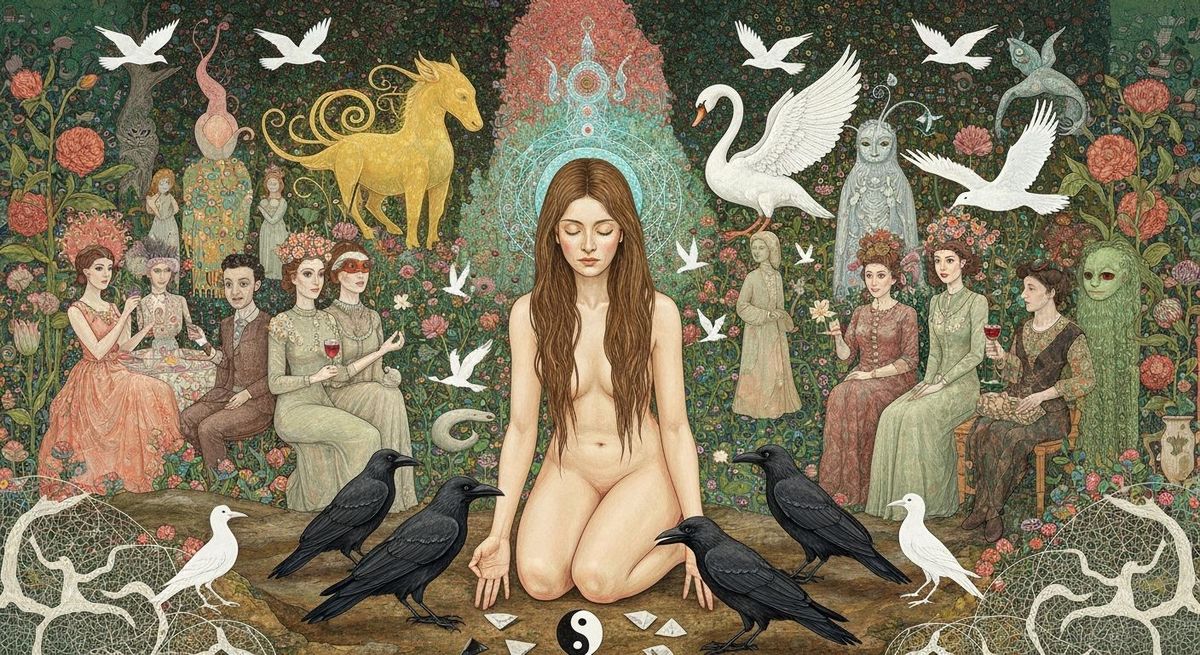 A surreal image of a woman kneeling on the ground, surrounded by crows and mythical creatures. The artwork features intricate textures, layered elements, and symbolic designs in a psychedelic art style.