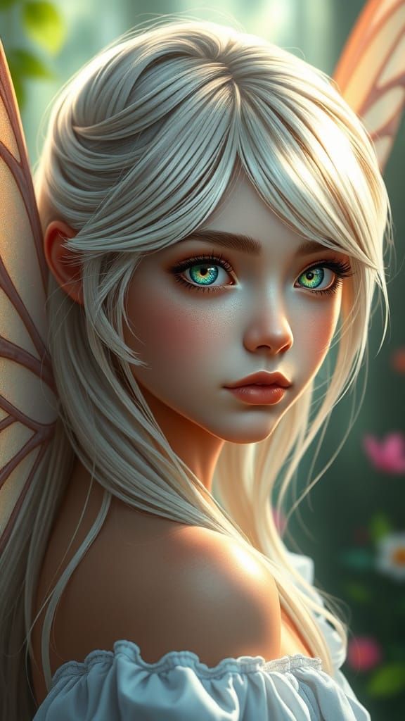 A striking picture of a beautiful blonde fairy with glowing green eyes. The portrait, rendered as digital art, features intricate details, soft lighting, and butterfly wings in a magical garden.
