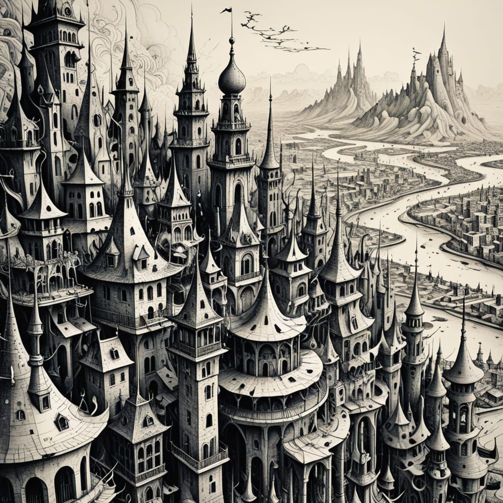 A detailed pen and ink drawing of a surreal, mystical city map. The dreamlike architecture features vibrant ink textures and expressive lines, reminiscent of surrealist art.