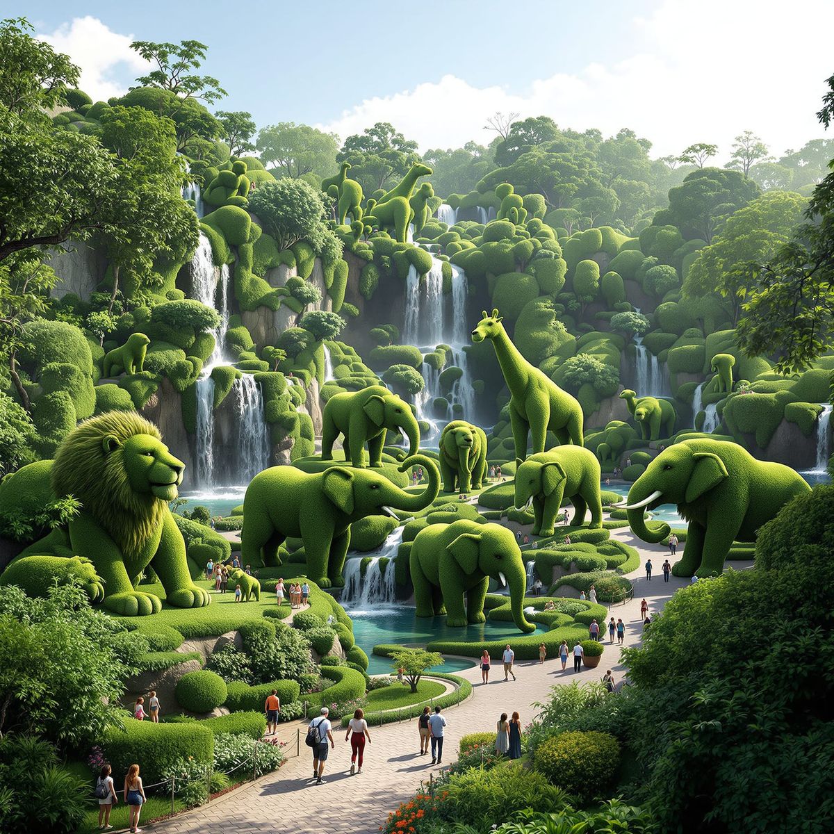 This image showcases a realistic zoo featuring intricately shaped topiary animals like lions and elephants, set against a backdrop of vibrant greenery and water features. Photorealistic style with natural lighting.