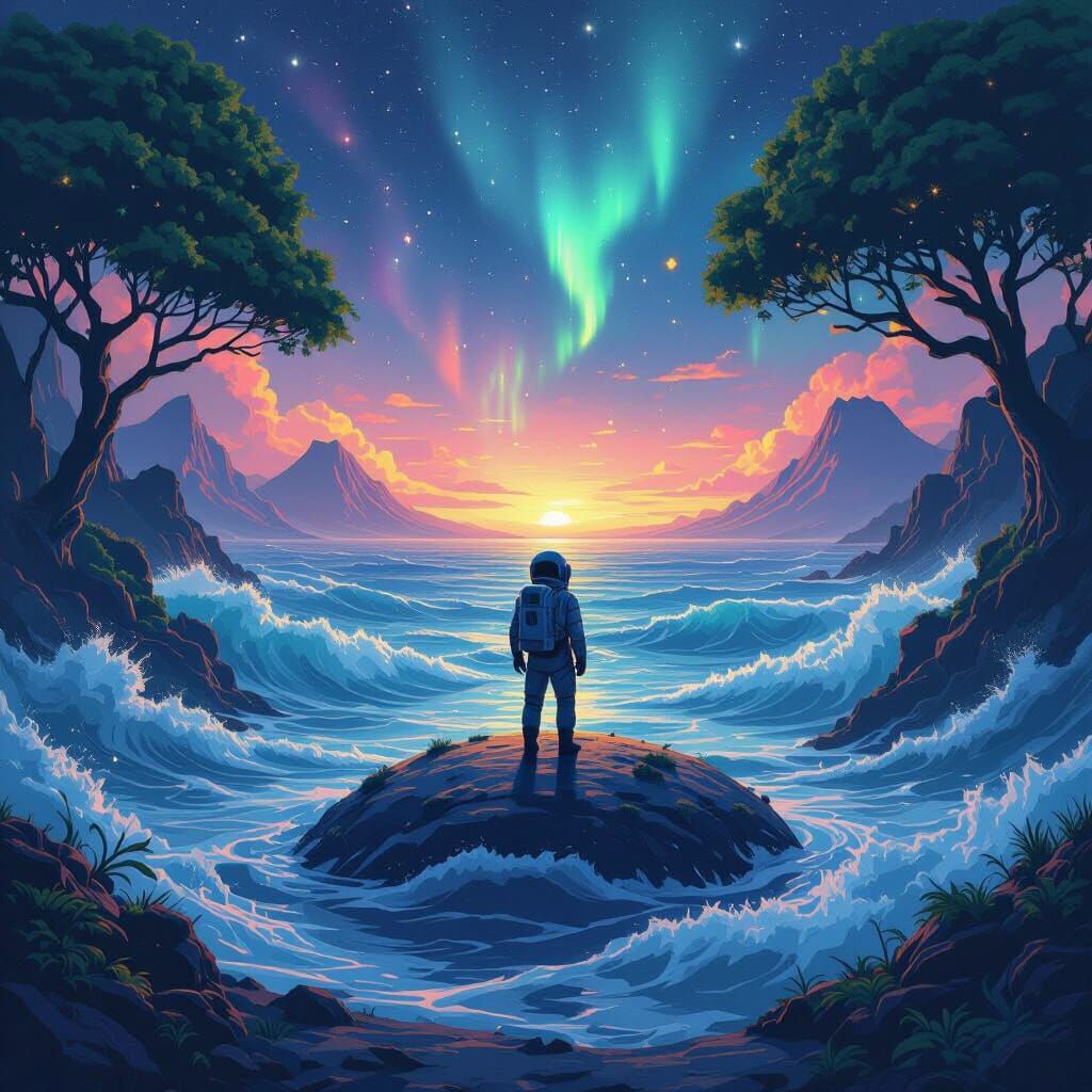 A striking picture of a solitary astronaut on a spherical world. The surreal scene features a stormy ocean, distant volcanoes, and a vibrant aurora borealis under large trees, in a muted, ethereal digital art style.