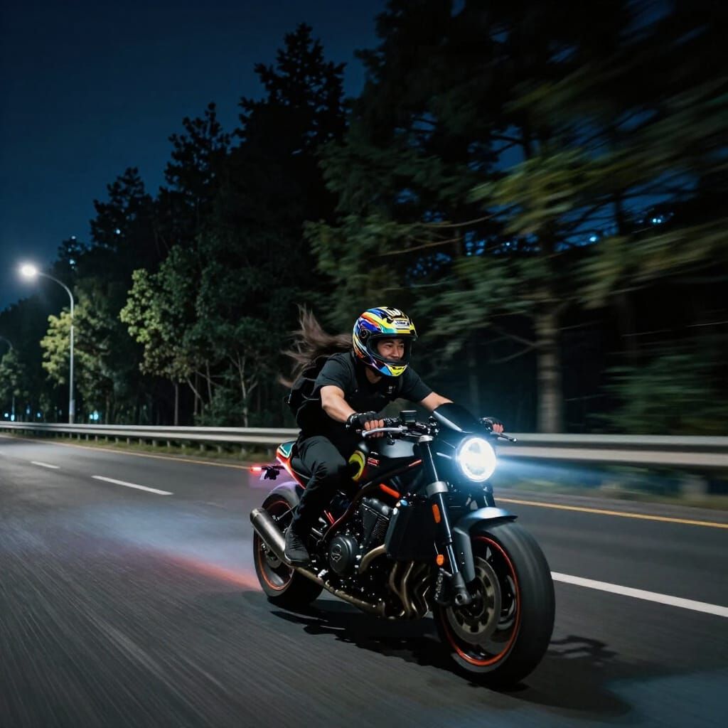 This image shows a lone rider on a futuristic motorcycle speeding down a dark highway at night. Neon accents, motion blur, and dramatic lighting create an epic, cinematic feel.