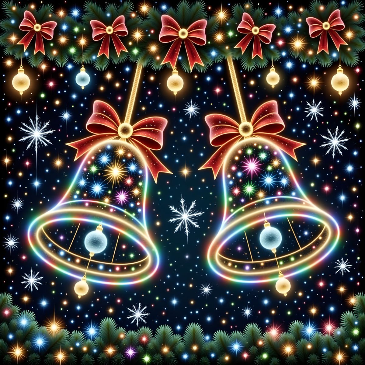 This image showcases two massive Christmas bells illuminated by multicolored lights against a dark night sky. Decorated with bows, ornaments, and snowflakes, it features a high-contrast, hyperrealistic holiday light display.