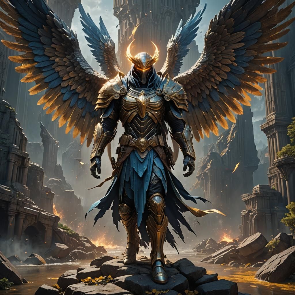 A detailed matte painting of Archangel Raziel in deep, rich colors. This fantasy concept art features intricate details and complementary colors, rendered in 8k resolution.