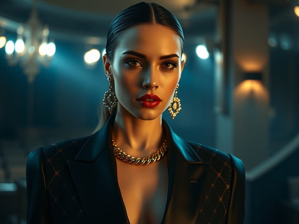 This image showcases a sophisticated woman in haute couture, captured with dramatic lighting and sharp designer silhouettes. It emphasizes photorealism and opulent textures for a high-fashion aesthetic.