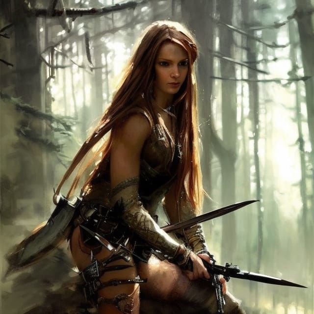 Long ginger hair, tanned elf in female medieval outfit, green eyes, antlers, fang necklace, hair tied in a ponytail, soft lighting, night scene, high fantasy style
