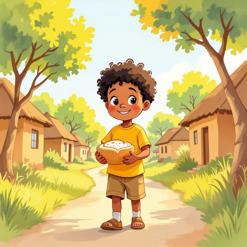 This image shows a cheerful African boy in a sunny village, rendered in a gentle watercolor storybook style with warm light and soft textures. The scene conveys kindness and simple joy.
