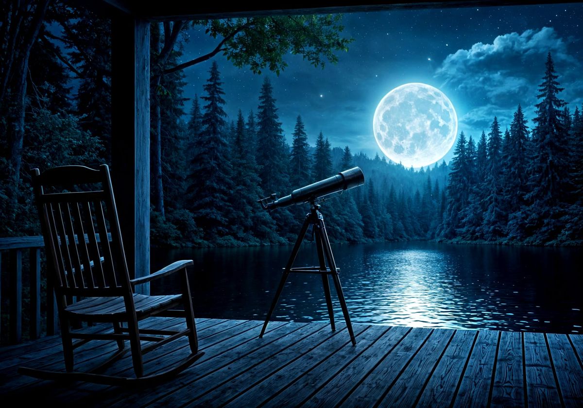 This image shows a tranquil nighttime scene. A telescope sits next to a rocking chair on a wooden porch, overlooking a sparkling lake and dark forest under a full moon. The image has a photorealistic style.