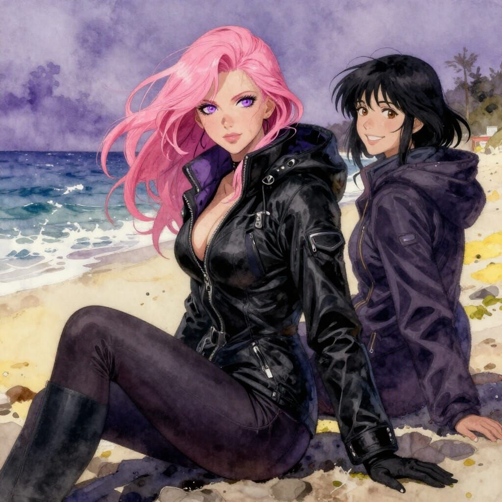 This image shows two women with striking hair colors and winter jackets enjoying a beach scene, rendered in a detailed watercolor style with complementary purple and yellow hues.