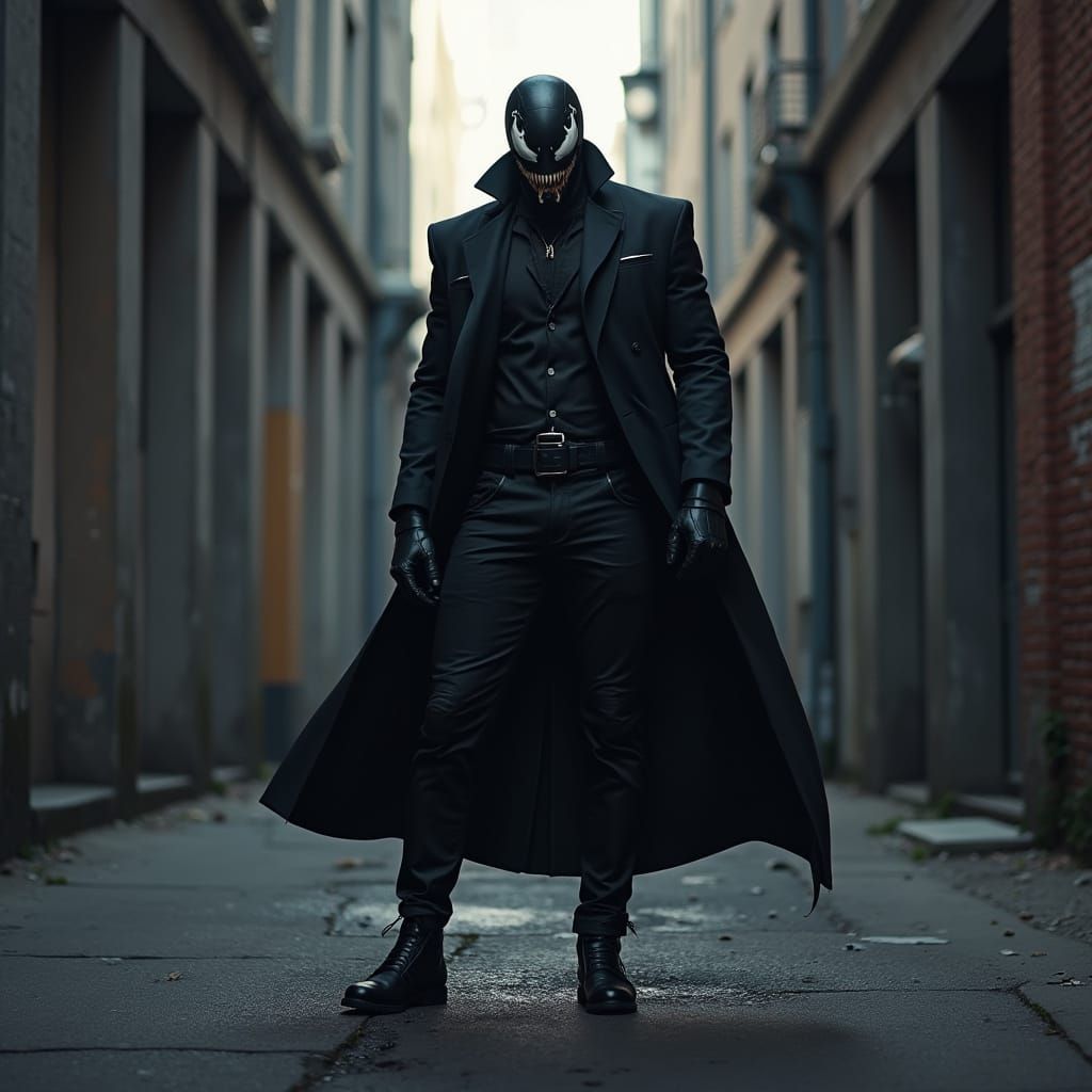 A mysterious figure in a black suit stands out in a dimly lit urban alley, blending noir and cyberpunk elements in a striking image.