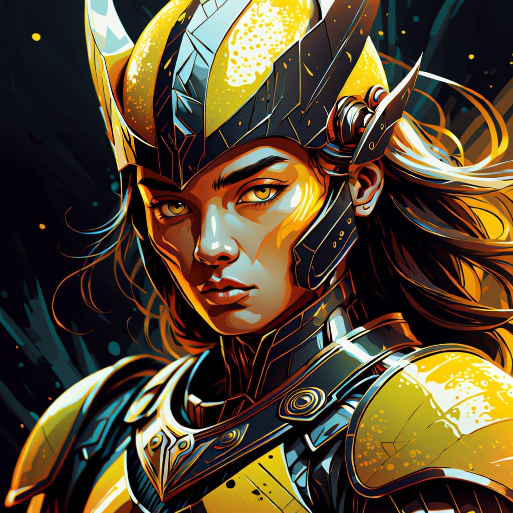 This image shows a close-up portrait of a warrior in a bright and bold lemon-patterned armor, holding a bat and radiating intensity, created in a dynamic and expressive style with soft brushstrokes and vibrant yellow hues, evoking a sense of fantasy and symbolism.