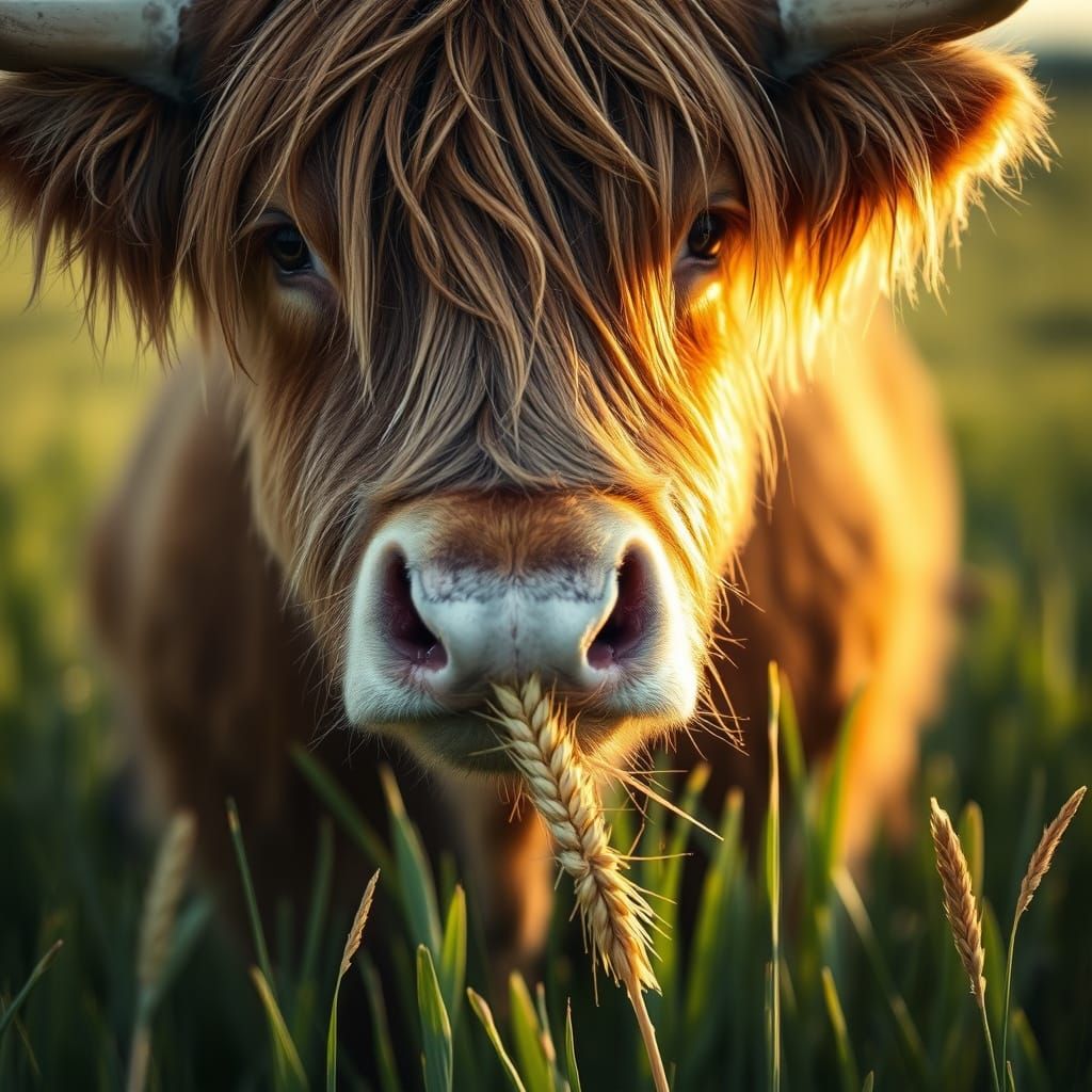 A serene close-up portrait of a majestic long-haired cow in a lush green meadow, gently holding a golden wheat ear in its mouth, with soft ambient light illuminating its rustic coat and evoking a sense of connection with nature, captured in a cinematic and intimate style